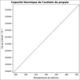 | Keywords: Capacité thermique acétate de propyle.svg fr Capacité thermique liquide calculée d'après <br/> Robert H Perry et Donald W Green Perry's Chemical Engineers' Handbook McGraw-Hill USA 1997 7e éd 2400 p ISBN 0-07-049841-5 p 2-170 own Epop 2010-06-28 Created with Gnumeric Heat capacity |
