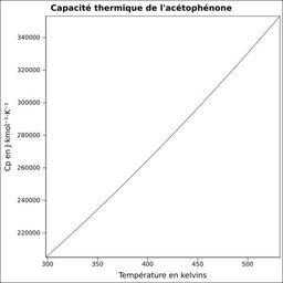 | Keywords: Capacité thermique acétophénone.svg fr Capacité thermique liquide calculée d'après <br/> Robert H Perry et Donald W Green Perry's Chemical Engineers' Handbook McGraw-Hill USA 1997 7e éd 2400 p ISBN 0-07-049841-5 p 2-170 own Epop 2010-06-28 Created with Gnumeric Heat capacity |