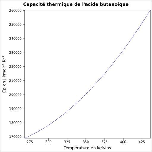 | Keywords: Capacité thermique acide butanoïque.svg  fr Capacité thermique liquide calculée d'après <br/> Robert H Perry et Donald W Green Perry's Chemical Engineers' Handbook McGraw-Hill USA 1997 7e éd 2400 p ISBN 0-07-049841-5 p 2-170 own Epop 2010-06-28 Created with Gnumeric Heat capacity |