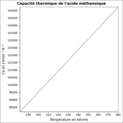 | Keywords: Capacité thermique acide méthanoïque.svg  fr Capacité thermique liquide calculée d'après <br/> Robert H Perry et Donald W Green Perry's Chemical Engineers' Handbook McGraw-Hill USA 1997 7e éd 2400 p ISBN 0-07-049841-5 p 2-170 own Epop 2010-06-28 Created with Gnumeric Heat capacity |