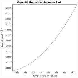 | Keywords: Capacité thermique butan-1-ol.svg fr Capacité thermique liquide calculée d'après <br/> Robert H Perry et Donald W Green Perry's Chemical Engineers' Handbook McGraw-Hill USA 1997 7e éd 2400 p ISBN 0-07-049841-5 p 2-170 own Epop 2010-06-28 Created with Gnumeric Heat capacity |