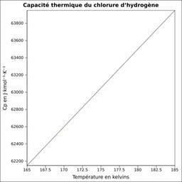 | Keywords: Capacité thermique chlorure d’hydrogène.svg fr Capacité thermique liquide calculée d'après <br/> Robert H Perry et Donald W Green Perry's Chemical Engineers' Handbook McGraw-Hill USA 1997 7e éd 2400 p ISBN 0-07-049841-5 p 2-170 own Epop 2010-06-28 Created with Gnumeric Heat capacity |