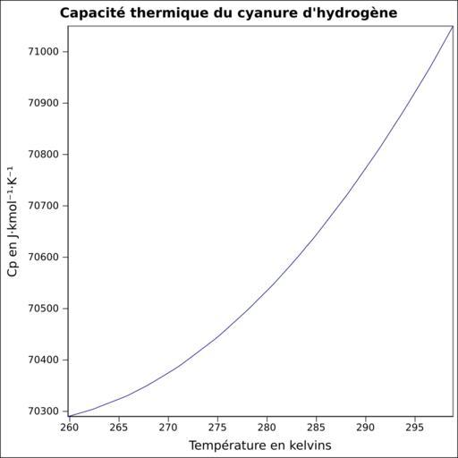 | Keywords: Capacité thermique cyanure d'hydrogène.svg  fr Capacité thermique liquide calculée d'après <br/> Robert H Perry et Donald W Green Perry's Chemical Engineers' Handbook McGraw-Hill USA 1997 7e éd 2400 p ISBN 0-07-049841-5 p 2-170 own Epop 2010-06-28 Created with Gnumeric Heat capacity |