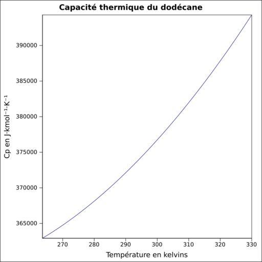 | Keywords: Capacité thermique dodécane.svg  fr Capacité thermique liquide calculée d'après <br/> Robert H Perry et Donald W Green Perry's Chemical Engineers' Handbook McGraw-Hill USA 1997 7e éd 2400 p ISBN 0-07-049841-5 p 2-170 own Epop 2010-06-28 Created with Gnumeric Heat capacity |