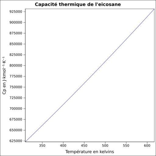 | Keywords: Capacité thermique eicosane.svg fr Capacité thermique liquide calculée d'après <br/> Robert H Perry et Donald W Green Perry's Chemical Engineers' Handbook McGraw-Hill USA 1997 7e éd 2400 p ISBN 0-07-049841-5 p 2-170 own Epop 2010-06-28 Created with Gnumeric Heat capacity |