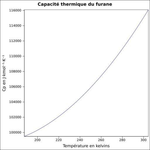 | Keywords: Capacité thermique furane.svg  fr Capacité thermique liquide calculée d'après <br/> Robert H Perry et Donald W Green Perry's Chemical Engineers' Handbook McGraw-Hill USA 1997 7e éd 2400 p ISBN 0-07-049841-5 p 2-170 own Epop 2010-06-28 Created with Gnumeric Heat capacity |