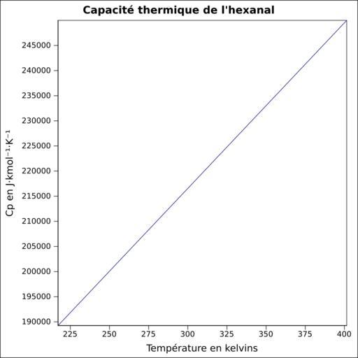 | Keywords: Capacité thermique hexanal.svg  fr Capacité thermique liquide calculée d'après <br/> Robert H Perry et Donald W Green Perry's Chemical Engineers' Handbook McGraw-Hill USA 1997 7e éd 2400 p ISBN 0-07-049841-5 p 2-170 own Epop 2010-06-28 Created with Gnumeric Heat capacity |
