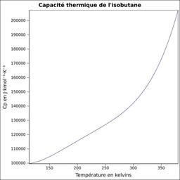 | Keywords: Capacité thermique isobutane.svg fr Capacité thermique liquide calculée d'après <br/> Robert H Perry et Donald W Green Perry's Chemical Engineers' Handbook McGraw-Hill USA 1997 7e éd 2400 p ISBN 0-07-049841-5 p 2-170 own Epop 2010-06-28 Created with Gnumeric Heat capacity |