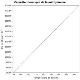 | Keywords: Capacité thermique méthylamine.svg fr Capacité thermique liquide calculée d'après <br/> Robert H Perry et Donald W Green Perry's Chemical Engineers' Handbook McGraw-Hill USA 1997 7e éd 2400 p ISBN 0-07-049841-5 p 2-170 own Epop 2010-06-28 Created with Gnumeric Heat capacity |