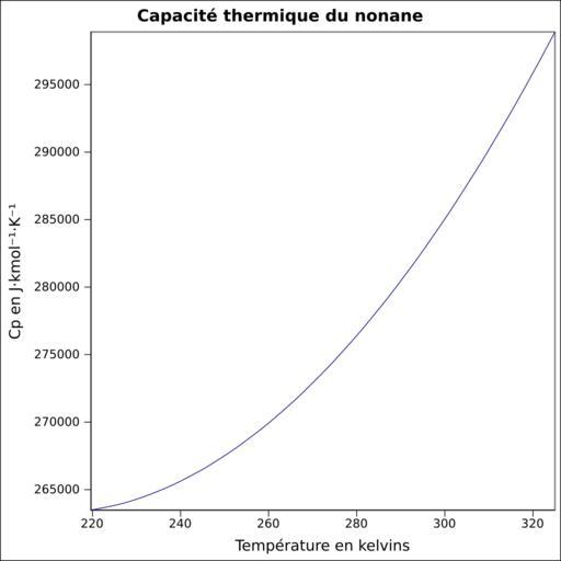 | Keywords: Capacité thermique nonane.svg  fr Capacité thermique liquide calculée d'après <br/> Robert H Perry et Donald W Green Perry's Chemical Engineers' Handbook McGraw-Hill USA 1997 7e éd 2400 p ISBN 0-07-049841-5 p 2-170 own Epop 2010-06-28 Created with Gnumeric Heat capacity |