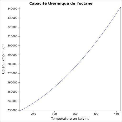 | Keywords: Capacité thermique octane.svg  fr Capacité thermique liquide calculée d'après <br/> Robert H Perry et Donald W Green Perry's Chemical Engineers' Handbook McGraw-Hill USA 1997 7e éd 2400 p ISBN 0-07-049841-5 p 2-170 own Epop 2010-06-28 Created with Gnumeric Heat capacity |