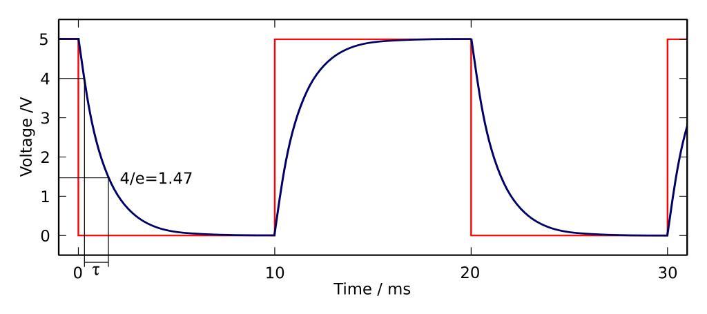 | Keywords: Capacitor Square wave charge-discharge.svg translation possible A diagram of the voltage across a capacitor and resistor blue during repeated charging-discharging by a square wave input voltage red with a period 20ms and a peak voltage of 5V The time constant <i> </i> is approximately 1 2ms Th Own drawing based on Lord Skunk's image Oszilloskopbild-Kondensator-Laden-und-entladen png 2006-11-26 inductiveload PD Capacitor Square wave charge-discharge de svg image Oszilloskopbild-Kondensator-Laden-und-entladen png Capacitor diagrams Waveforms Transverse wave |