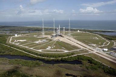 Keywords: cape canaveral florida nasa outside launch pad aerial view sea ocean water grass plants scenic sky clouds