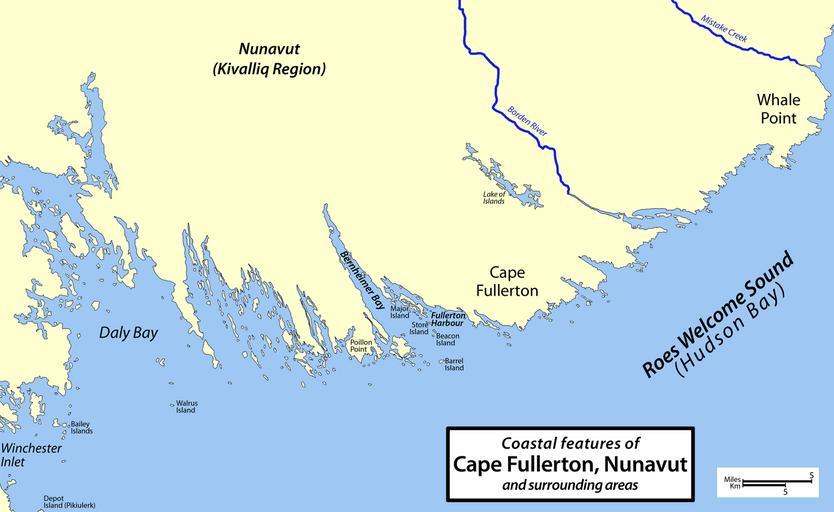Keywords: Cape Fullerton.png Map of Cape Fullerton Nunavut Canada and surrounding areas including Whale Point Daly Bay Bernheimer Bay Fullerton Harbour Winchester Inlet Depot Island Pikiulerk Bailey Islands Walrus Island Poillon Point Major Island Store Island Beacon island Barrel Island Lake of Islands Borden River and Mistake Creek Own 2008 Cbaer Check categories 2008 November 11 en wikipedia Cape_Fullerton Maps of Nunavut |