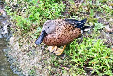Keywords: cape shoveler duck anas smithii large bill beak brown feathers webbed feet water waterfowl bank close-up detail