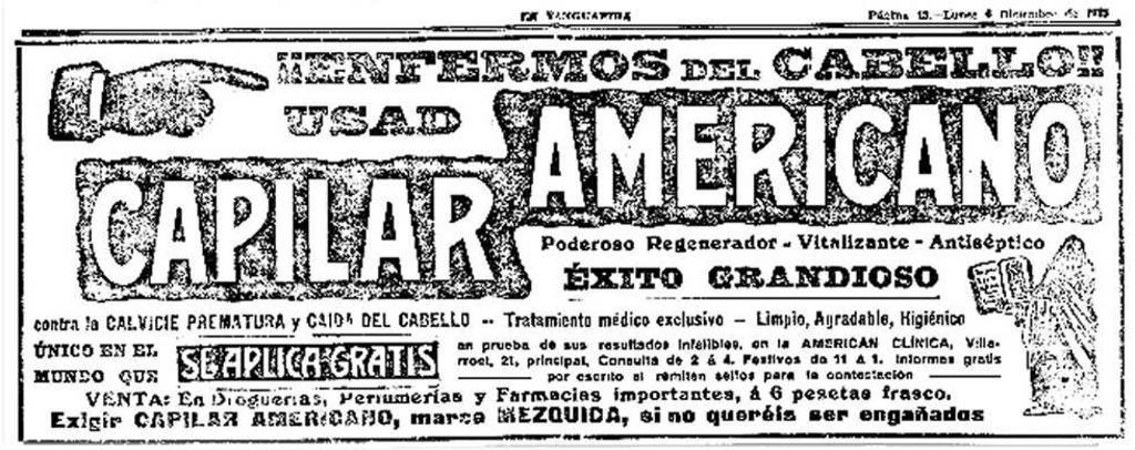 Keywords: Capilar-Americano-1915-12-06.jpg es Capilar Americano poderoso regenerador - vitalizante - antiseptico - se aplica gratis en prueba en la American Clinica Villarroet 21 principal Bartcelona 1915-12-06 La Vanguardia Barcelona 6 12 1915 pag 13 Dr- Mezquida Enfermos del cabello Usad CAPILAR AMERICANO Poderoso regenerador “ Vitalizzante “ Antiseptico EXITO GRANDIOSO Contra la calvicie prematura y caida del cabello “ Tratamiento medico exclusivo “ Limpio Agradable Higienico Unico en el mundo que se APLICA GRATIS en prueba de sus resultados infalibles en la AMERICAN CLINICA Villarroel 21 principal Consulta de 2 a 4 Festivos de 11 a 1 Informes gratis “ por escrito si remiten sellos para la contestacion --- Venta en Droguerias Perfumerias y Farmacias importantes a 6 pesetas frasco Exigir CAPILAR AMERICANO marco MEZQUIDA si no quereis ser engañados PD-old Capilar Americano Capilar Americano Vanguardia 1915 advertisements in Spain American Clinica Carrer Villaroel 21 ImageNote 1 35 43 873 321 979 388 2 Enfermos del cabello Usad CAPILAR AMERICANO Poderoso regenerador “ Vitalizzante “ Antiseptico EXITO GRANDIOSO Contra la calvicie prematura y caida del cabello “ Tratamiento medico exclusivo “ Limpio Agradable Higienico Unico en el mundo que se APLICA GRATIS en prueba de sus resultados infalibles en la AMERICAN CLINICA Villarroel 21 principal Consulta de 2 a 4 Festivos de 11 a 1 Informes gratis “ por escrito si remiten sellos para la contestacion --- Venta en Droguerias Perfumerias y Farmacias importantes a 6 pesetas frasco Exigir CAPILAR AMERICANO marco MEZQUIDA si no quereis ser engañados ImageNoteEnd 1 |