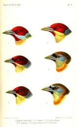 | Keywords: CapitoKeulemans.jpg 1 top left Capito versicolor <small>Müll </small> Eubucco versicolor versicolor <small> P L S Müller 1776 </small><br/> 2 top right Capito steeri <small>Scl Salv </small> Eubucco versicolor steeri <small> P L Sclater 1878 </small><br/> 3 center left Capito richardsoni <small>Gray</small> Eubucco richardsoni richardsoni <small> G R Gray 1846 </small><br/> 4 center right Capito salvini <small>Shelley</small> Eubucco bourcierii salvini <small> Shelley 1891 </small><br/> 5 bottom left Capito granadensis <small>Shelley</small> Eubucco richardsoni richardsoni <small> G R Gray 1846 </small><br/> 6 bottom right Capito bourcieri <small> Lafr </small> Eubucco bourcierii bourcierii <small> Lafresnaye 1845 </small> Versicoloured Barbet top row - Lemon-throated Barbet center/bottom left - Red-headed Barbet center/bottom right Cabézon élégant ligne du dessus - Cabézon à poitrine d'or gauche-centre/-dessous - Cabézon à tête rouge droit-centre/-dessous Buntbartvogel obere Reihe - Goldbrust-Bartvogel Mitte/unten links - Andenbartvogel Mitte/unten rechts Cabezón Versicolor fila superior - Cabezón Pechiamarillo centro/fondo izquierdo - Cabezón Cabecirrojo centro/fondo derecho Catalogue of the birds in the British Museum http //www archive org/details/catalogueofbirds19brit Vol 19 Plate V 1891 creator John Gerrard Keulemans Philip Lutley Sclater G E Shelley text PD-old-100 Eubucco richardsoni jpg Catalogue of the Birds in the British Museum John Gerrard Keulemans Eubucco Eubucco versicolor Eubucco richardsoni Eubucco bourcierii bird heads |