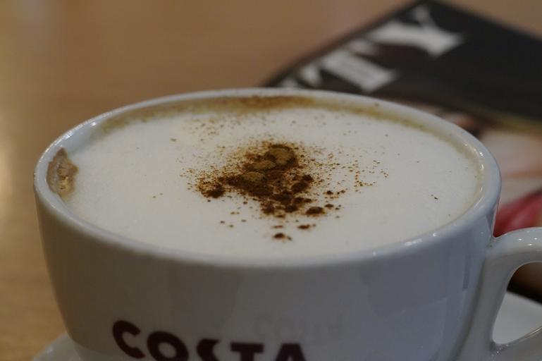 Keywords: cappuccino coffee cinnamon foam coffee cup café closeup drink morning magazine