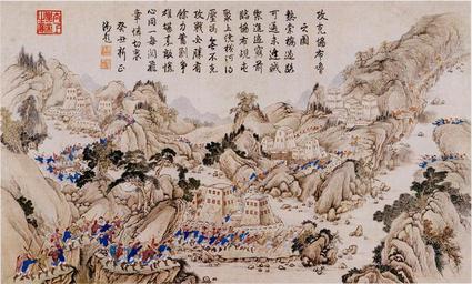 | Keywords: Capture of Xiebulu.jpg 尼泊爾加德满都西北)之情形 上 乾隆皇 御題詩曰:<br> 熱索橋過路可 ,<br> 賊御 追窮 <br> 前臨協布覘屯聚,<br> 上繞橫河得壓溤 <br> 無不克攻戰必 ,<br> 餘力蓄剿爭雄 <br> 堪嘉敵愾心同 ,<br> 每閱飛章憐切衷 en A scene of the Gurkha Campaign Nepal 1792 - 1793 http //www battle-of-qurman com cn/e/hist htm late XVIII century A collaboration between Chinese and European painters The Jesuit missionaries involved in producing the drawings in China were Giuseppe Castiglione Jean-Denis Attiret Ignace Sichelbart and Jean Damascene The engravings were executed in Paris under the direction of Charles-Nicolas Cochin of the Académie Royal at the Court of Louis XVI and the individual engravers include Le Bas Aliamet Prevot Saint-Aubin Masquelier Choffard and Launay PD-Art Gurkha Campaigns 1788-1792 Military of Qing China Paintings of the Qing Dynasty |