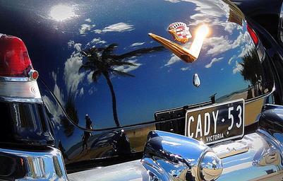 Keywords: car bumper chrome automobile motor old vintage reflection palm trees beach shiny classic car