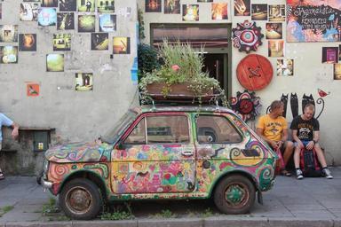 Keywords: car old colored historic cars flower bed plants green local hard drive