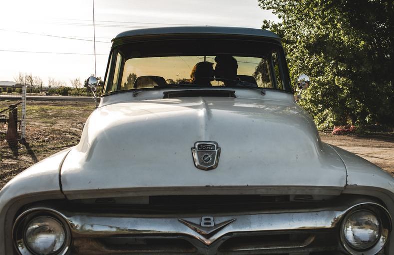 Keywords: car oldtimer vehicle automobile vintage classic old retro design american chrome ford couple inside kissing restored transportation front nostalgia