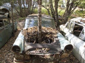 Keywords: car scrap moss old forest rust green rusty automotive shredder residue abandoned tree trunk