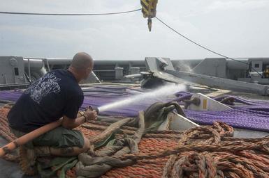 | Keywords: CARAT 2014 Indonesia 140613-N-NT265-437.jpg en U S Navy Diver 1st Class Carlos Marin assigned to Mobile Diving Salvage Unit 1 Company 1-5 hoses down an anchor aboard the rescue and salvage ship USNS Safeguard during a diving exercise June 13 2014 in Banten Bay Indonesia as part of Cooperation Afloat Readiness and Training 2014 Indonesia CARAT is a series of bilateral exercises held annually in Southeast Asia to strengthen relationships and enhance force readiness 2014-06-13 T-ARS 50 https //www dvidshub net/image/1416980 140613-N-NT265-437 2014-06-24 22 01 BANTEN BAY ID PD-USGov-Military-Navy Cooperation Afloat Readiness and Training 2014 Images from DoD uploaded by Fæ |