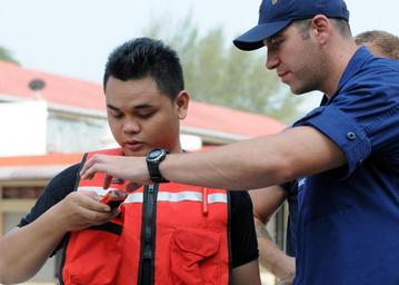 | Keywords: CARAT Malaysia 2012 120616-N-KB052-100.jpg en U S Coast Guard Boatswain's Mate 2nd Class Chad Gagnon assigned to the Legend-class national security cutter USCGC Waesche WMSL 751 shows the proper wear and use of a rescue swimmer life jacket to a member of the Malaysia Maritime Enforcement Agency during a survival swimming and dive technique training event The event is part of Cooperation Afloat Readiness and Training CARAT Malaysia 2012 CARAT is a series of bilateral military exercises between the U S Navy and the armed forces of Bangladesh Brunei Cambodia Indonesia Malaysia the Philippines Singapore and Thailand Timor Leste joins CARAT for the first time in 2012 U S Navy photo by Mass Communication Specialist 1st Class N Ross Taylor/Released 2012-06-16 Petty Officer 1st Class Ross Taylor https //www dvidshub net/image/606660 120616-N-KB052-100 2012-06-19 03 52 LUMUT MY PD-USGov-Military-Navy USCGC Waesche WMSL-751 Cooperation Afloat Readiness and Training 2012 Images from DoD uploaded by Fæ |