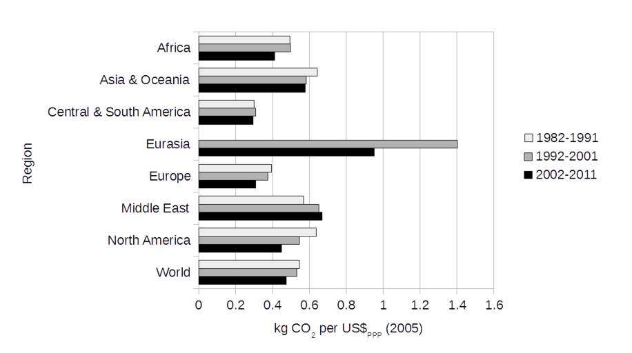 | Keywords: Carbon intensity of GDP (using PPP) for different regions, 1982-2011.png gross domestic product GDP for different regions between the years 1982 and 2011 Carbon intensity of GDP is defined as annual carbon dioxide emissions divided by annual GDP Carbon dioxide emissions are measured in kilograms GDP is measured in US dollars year 2005 values using purchasing power parities PPP The regions are Africa Asia and Oceania Central and South America Eurasia Europe the Middle East North America and the world These regional groupings are defined in a later section Three carbon intensity values are given for each region which are averaged over the years 1982 to 1991 1992 to 2001 and 2002 to 2011 Data are given in a later section Intensities show variations regionally and over time Global carbon intensity has on average fallen over this time period References Data are from a public-domain source citation http //www eia gov/cfapps/ipdbproject/iedindex3 cfm tid 91 pid 47 aid 31 cid regions syid 1980 eyid 2011 unit MTCDPUSD US Energy Information Administration International Energy Statistics Carbon Intensity using Purchasing Power Parities Metric Tons of Carbon Dioxide per Thousand Year 2005 U S Dollars 11 October 2014 Archived https //web archive org/web/20141011065041/http //www eia gov/cfapps/ipdbproject/iedindex3 cfm tid 91 pid 47 aid 31 cid regions syid 1980 eyid 2011 unit MTCDPUSD 11 October 2014 2014-10-27 08 10 26 own Enescot other versions Regions wikitable - Africa Algeria Angola Benin Botswana Burkina Faso Burundi Cameroon Cape Verde Central African Republic Chad Comoros Congo Brazzaville Congo Kinshasa Cote dIvoire Ivory Coast Djibouti Egypt Equatorial Guinea Eritrea Ethiopia Gabon Gambia The Ghana Guinea Guinea-Bissau Kenya Lesotho Liberia Libya Madagascar Malawi Mali Mauritania Mauritius Morocco Mozambique Namibia Niger Nigeria Reunion Rwanda Saint Helena Sao Tome and Principe Senegal Seychelles Sierra Leone Somalia South Africa Sudan and South Sudan Swaziland Tanzania Togo Tunisia Uganda Western Sahara Zambia Zimbabwe - Asia and Oceania Afghanistan American Samoa Australia Bangladesh Bhutan Brunei Burma Myanmar Cambodia China Cook Islands Fiji French Polynesia Guam Hawaiian Trade Zone Hong Kong India Indonesia Japan Kiribati Korea North Korea South Laos Macau Malaysia Maldives Mongolia Nauru Nepal New Caledonia New Zealand Niue Pakistan Papua New Guinea Philippines Samoa Singapore Solomon Islands Sri Lanka Taiwan Thailand Timor-Leste East Timor Tonga U S Pacific Islands Vanuatu Vietnam Wake Island - Central and South America Antarctica Antigua and Barbuda Argentina Aruba Bahamas The Barbados Belize Bolivia Brazil Cayman Islands Chile Colombia Costa Rica Cuba Dominica Dominican Republic Ecuador El Salvador Falkland Islands Islas Malvinas French Guiana Grenada Guadeloupe Guatemala Guyana Haiti Honduras Jamaica Martinique Montserrat Netherlands Antilles Nicaragua Panama Paraguay Peru Puerto Rico Saint Kitts and Nevis Saint Lucia Saint Vincent/Grenadines Suriname Trinidad and Tobago Turks and Caicos Islands Uruguay Venezuela Virgin Islands U S Virgin Islands British - Eurasia Armenia Azerbaijan Belarus Estonia Former U S S R Georgia Kazakhstan Kyrgyzstan Latvia Lithuania Moldova Russia Tajikistan Turkmenistan Ukraine Uzbekistan - Europe Albania Austria Belgium Bosnia and Herzegovina Bulgaria Croatia Cyprus Czech Republic Denmark Faroe Islands Finland Former Czechoslovakia Former Serbia and Montenegro Former Yugoslavia France Germany Germany East Germany West Gibraltar Greece Hungary Iceland Ireland Italy Luxembourg Macedonia Malta Montenegro Netherlands Norway Poland Portugal Romania Serbia Slovakia Slovenia Spain Sweden Switzerland Turkey United Kingdom - Middle East Bahrain Iran Iraq Israel Jordan Kuwait Lebanon Oman Palestinian Territories Qatar Saudi Arabia Syria United Arab Emirates Yemen - North America Bermuda Canada Greenland Mexico Saint Pierre and Miquelon United States Data International data for carbon dioxide emissions from the consumption of energy include emissions due to the consumption of petroleum natural gas and coal and also from natural gas flaring These data do not include emissions from geothermal power generation cement production and other industrial process or municipal solid waste combustion - http //www eia gov/cfapps/ipdbproject/docs/IPMNotes html ind Notes for International Energy Statistics archived https //web archive org/web/20140704234711/http //www eia gov/cfapps/ipdbproject/docs/IPMNotes html ind 4 July 2014 wikitable sortable - 1982-1991 1992-2001 2002-2011 - Africa 0 49418 0 49673 0 41130 - Asia Oceania 0 64296 0 58278 0 57559 - Central South America 0 30161 0 30919 0 29500 - Eurasia NA 1 40197 0 95046 - Europe 0 39509 0 37436 0 30891 - Middle East 0 56924 0 65200 0 66899 - North America 0 63809 0 54624 0 44778 - World 0 54506 0 53017 0 47386 cc-zero Uploaded with UploadWizard Greenhouse emissions |