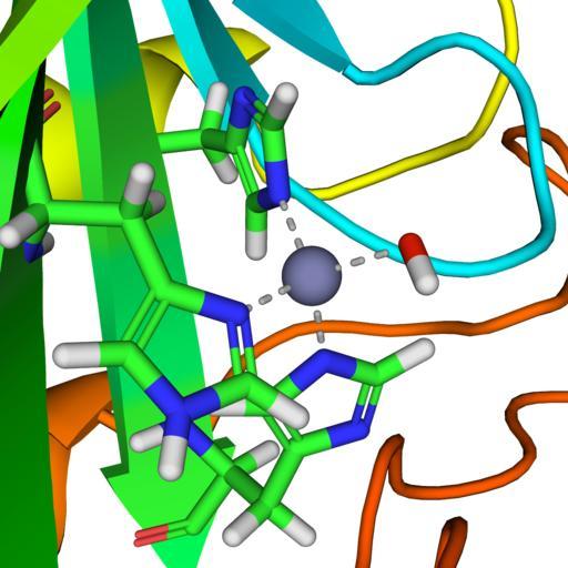 Keywords: Carbonic anhydrase 1CA2 active site.png Closeup of active site of human carbonic anhydrase II showing three histidine residues and hydroxide red and white coordinating zinc gray <br>Created using PyMOL http //www pymol org and GIMP ; Legend 7d80b0 Zinc ion From PDB entry http //www rcsb org/pdb/cgi/explore cgi pdbId 1CA2 1CA2 2011-05-28 Own Image Carbonic anhydrase 1CA2 png ” full view Lyases Metalloproteins |