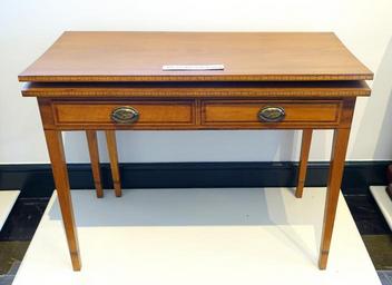 | Keywords: Card table, maker unknown, Rutland VT, c. 1810, cherry, birch, poplar, pine, mahogany veneer - Bennington Museum - Bennington, VT - DSC08827.JPG en Exhibit in the Bennington Museum - Bennington Vermont USA This work is in the public domain because the artist died more than 70 years ago Photography was permitted in the museum without restriction 2015-02-28 13 42 47 own Daderot other versions PD-old-70 cc-zero Furniture in the Bennington Museum Furniture from Vermont | ||||