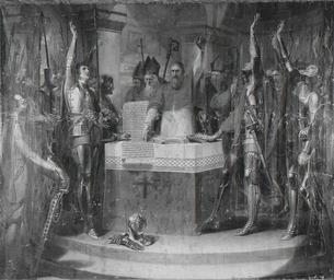 | Keywords: Cardinal Langton and the Barons at St Edmundsbury.jpg en The subject is recorded in Roger of Wendover's 'Flores historiarum' on St Edmund's Day 20 November 1214 the nobles and barons of England met at St Edmund's Abbey to swear that if King John refused to uphold the liberties and laws granted to the church under the Cardinal-Archbishop of Canterbury Stephen Langton d 1228 they would withdraw their allegiance to the crown 1787 Oil on canvas cm 32 38 1 Institution Ashmolean Museum object history Presented by William Martin the artist 1796 exhibition history credit line accession number WA1845 40 place of creation cardinal-langton-and-the-barons-at-st-edmundsbury <gallery> File Charter of Liberties jpg </gallery> Custom license marker 2014 09 11 PD-old-100 Uploaded with UploadWizard Magna Carta in art |