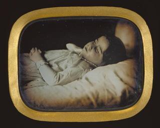 | Keywords: Carl Durheim, Postmortem of a Child, Getty 64235.jpg Artwork Creator Carl Durheim The careful and sensitive arrangement of this child's body and bedclothes the choice of viewpoint and the reliance upon light to create a sense of reality individuality and remoteness demonstrate Charles Durheim's skill as a daguerreotypist circa 1852 daguerreotype hand-colored 1/4 plate<br /> image Size cm 9 4 6 8 <br /> object Size cm 15 1 12 7 Institution Getty Center cite book Lowry Bates Isabael Barrett Lowry The Silver Canvas Daguerreotype Masterpieces from the J Paul Getty Museum exh cat Los Angeles J Paul Getty Museum 1998 121 exhibition history Temporary Exhibition The Art of the Daguerreotype The J Paul Getty Museum at the Getty Center Los Angeles 1998-04-14 1998-07-12 H B eagle 40 plate mark lower right corner all sideways ~ <br /> Imprinted on label verso backing on blue paper in black ink <br /> DESSINS / a la PLUME / et au / CRAYON verso left fr LITHOGRAPHIE / CH DURHEIM / Grand vue 183 à Berne / ATELIER PHOTOGRAPHIQUE / Portraits au Daguerreotype / Sur plaques papier verso center fr verre et sur ivoire / se font en Pavillon vitre verso center fr CARTES / de / VISITES / et d' / ADRESSES verso right fr In the mid-1800s it became common to use the new medium of photography to create a memento mori such as this one accession number 84 XT 267 9 64235 http //search getty edu/museum/records/musobject objectid 64235 <br /> http //www getty edu/art/collection/objects/57725/carl-durheim-postmortem-of-a-child-swiss-about-1852/ <br /> PD-old-auto 1890 Getty Research Institute-no known copyright restrictions Carl Durheim Daguerreotypes Memento mori Dead children in art |