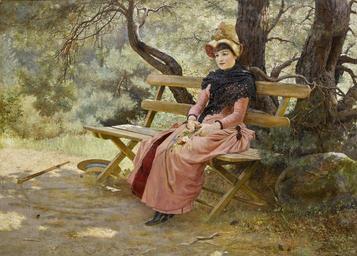 | Keywords: Carl Erik Törner - Förlorade i tanken.jpg Fredrik Carl Erik Törner 1862-1911 title Lost in thought Förlorade i tanken In Gedanken versunken 1886 oil canvas cm 147 5 203 5 object history Private collection credit line C E Törner Dalarö 86 signature/place/date lower right on remnants of an old label accession number http //www bonhams com/auctions/16863/lot/24/ Bonhams Other versions PD-Art-100 Fredrik Carl Erik Törner Portrait paintings of women 1886 paintings Images from Bonhams Paintings of women sitting on outdoor benches Daydreams in art |