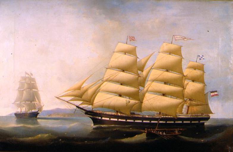 Keywords: Carl Justus Fedeler - Ship Portrait of German Ship ‚EUROPA‘ and the Bark ‚UNION‘.jpg Carl Justus Fedeler 1837-1897 de Das Vollschiff EUROPA wurde 1854 für 46 250 Taler bei Johann Lange in Vegesack für die Reederei D H Wätjen Co erbaut Der Stapellauf war am 25 April 1854 die Länge im Kiel betrug 44 6 m die Breite 10 2 m es war vermessen mit 374 Commerzlasten 864 NRT In den ersten 3 Jahren segelte das Vollschiff unter Kapitän W J Ariaans mit etwa 400 Passagieren nach Amerika und mit Tabak und Baumwolle nach Europa zurück Ein Kohletransport führte die EUROPA 1857 von Cardiff nach Bombay wo sie von verschiedenen Firmen gechartert mit Fahrten zwischen Calcutta Bassein Singapur Hongkong Macao Kanton und Shanghai festgehalten wurde bis sie im Februar 1860 mit 500 chinesischen Passagieren in Sydney anlegte 1861 nahm sie unter Kapitän B v Hagen die Tabak- und Baumwollfahrt wieder auf die jedoch 1862/63 und 66- immer für 8-10 Monate - unterbrochen wurde da die EUROPA von New York aus für Transporte nach Callao von Gildemeisters gechartert wurde Auf dem Rückweg brachte sie Guano für Liverpool und zwei Ladungen Salpeter für New York Auf ihrer dritten Fahrt zum Kap Horn brach an Bord Typhus aus Sechs Mann wurden in das Hospital von Rio eingeliefert und erst nach vierwöchiger Quarantäne konnte die Reise fortgesetzt werden Mit Maryland-Tabak kam die Europa nach langer Abwesenheit im August 1867 nach Bremen Hier wurde sie für 20 000 Taler an die Bremer Reederei Joh Friedr Arens verkauft die den Segler bis 1884 bereederten und weiter an J Ingmansson Elleholm Schweden verkauften 1890 ging der Segler verloren <br/> Die auf dem Gemälde von C Fedeler dargestellte Bremer Bark UNION trägt wie die EUROPA die Arens´sche Reedereiflagge im Top Der Segler UNION gebaut 1863 bei Toby Littlefield in Portsmouth N H USA vermessen mit 1183 BRT ex SEMIRAMIS gehörte ebenfalls der Reederei Joh Friedr Arens unter der Führung von Kapitän Fokken Später diente der Segler der Deutschen Dampffischereigesellschaft Nordsee in Nordenham als Eistransportschiff > 1882 oil canvas cm Werder Collection Germany object history credit line accession number http //www fineartemporium com/we-Fedeler-Europa-image htm fineartemporium com PD-Art-100 Carl Justus Fedeler Europa ship 1854 Union ship 1863 19th-century sailing ships in paintings Historical images of square-riggers under sail History of saltpeter works 1860s paintings |
