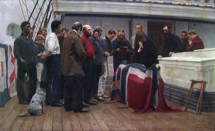 | Keywords: Carl Sundt-Hansen En begravelse ombord.jpg Artwork Carl Sundt-Hansen 1841-1907 1890 Oil on canvas cm 143 5 88 Institution Nasjonalgalleriet http //digitaltmuseum no/things/en-begravelse-ombord-maleri/NMK-B/NG M 03178 Digitalt Museum other versions PD-old-100 Paintings by Carl Sundt-Hansen Paintings in the Nasjonalgalleriet 1890 paintings in Norway 19th-century oil on canvas paintings 19th-century paintings of dogs Christian burials in art Images from Digitalt Museum Norway Funerals in Norway Men of Norway in art 19th-century funerals and mourning in painting 19th-century paintings from Norway |