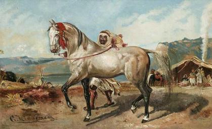 | Keywords: Carl Zimmermann - Araber mit Schimmel.jpg vor Zeltlager in Küstenlandschaft oil canvas cm 23 5 39 5 object history credit line accession number http //www auktion-bergmann de/ufItemInfo aspx i_id 257590 a_id 83 ShowTop 100 Auktionshaus Bergmann 2007 03 10 lot 656 PD-old-auto 1930 Carl Zimmermann Orientalist paintings Grey horses in art Images from Auktionshaus Bergmann | ||||