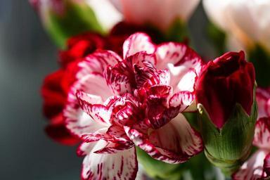 Keywords: carnation cultivar dianthus caryophyllus red and white stripe flower dianthus perennial border plant grey leaf button hole boutonnière wedding close-up macro detail