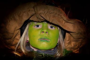 Keywords: carnival panel forest spirit child girl face melted green costume masquerade