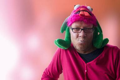 Keywords: carnival panel melted mask monster costume headwear cap tongue foot eyes large green red pink plush foolish fool man glasses kiss mouth three day beard