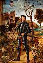 | Keywords: Carpaccio - Young knight in a landscape - unrestored.jpg artwork Creator Vittore Carpaccio en one of the earliest full-length portraits in European painting; before restoration as the two notes are missing 1510 Oil canvas cm 218 5 152 5 institution Museo Thyssen-Bornemisza 7 http //www museothyssen org/en/thyssen/ficha_obra/556 Museo Thyssen-Bornemisza http //www metmuseum org/pubs/journals/1/pdf/1512800 pdf bannered pdf Metropolitan Museum Journal 18 1984 pdf; 4 2 MB object history -1919 Vernon-Wentworth collection Yorkshire ProvenanceEvent 1919-11 purchase Otto H Kahn Vernon-Wentworth collection Yorkshire ProvenanceEvent 1935 purchase Baron Heinrich Thyssen- Bornemisza Otto H Kahn exhibition history 1963 Venice Carpaccio; 1981 Old Master Paintings from the Collection of Baron Thyssen-Bornemisza Metropolitan Museum New York credit line en before restoration because inscriptions and notes are missing 1 The painting was attributed to Dürer until 1919 due to a now removed fake monogram and as the two inscriptions were concealed by over-paint until the restoration 1958 2 The identity of the knight is controversial Following Helen Comstock the weasel could suggest that he belongs to the Order of the Ermine founded in 1465 by King Ferdinand I of Naples In 1938 Agathe Rona following her suggested that the knight was Ferdinand II of Aragon and that the Order of the Ermine was associated with the house of Aragon Neapolitan branch Since the catalogue of an exhibition on Carpaccio held in Venice in 1963 Weiss identified the knight as Francesco Maria della Rovere 3rd Duke of Urbino and this is accepted by the majority including Museo Thyssen-Bornemisza There are still more theories identifying the young knight as a Habsburg prince as Antonio da Montefeltro as a German soldier in the service of Venice or as Rolando de RagusaVenturi accession number INV 82 1935 3 </onlyinclude> PD-Art-100 Young Knight in a Landscape by Carpaccio |