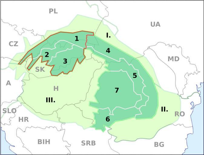 | Keywords: Carpathians Western.svg Western Carpathians outlined in red <br> 1 Outer Western Carpathians <br> 2 Central Western Carpathians <br> 3 Inner Western Carpathians <br> 4 Outer Eastern Carpathians <br> 5 Inner Eastern Carpathians <br>6 Southern Carpathians <br> 7 Apuseni West-Romanian Mountains and Transylvanian Plateau <br> I Subcarpathian depressions <br> II Romanian Lowlands <br> III Pannonian Basin <br>----<br> Karpaty Zachodnie w czerwonym konturze <br> 1 Zewnętrzne Karpaty Zachodnie <br> 2 Centralne Karpaty Zachodnie <br>3 Wewnętrzne Karpaty Zachodnie <br> 4 Zewnętrzne Karpaty Wschodnie <br> 5 Wewnętrzne Karpaty Wschodnie <br> 6 Karpaty Południowe <br> 7 Góry Zachodniorumuńskie i Wyżyna Transylwańska <br> I Podkarpacie <br> II Równiny Południoworumuńskie <br> III Kotlina Panońska Own PM / P 13 IX 2009 pl Polish language Wikipedia P SVG maps of Europe Maps of the Carpathian Mountains |