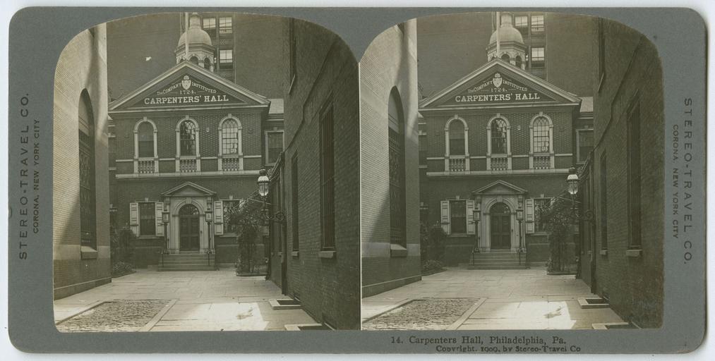 | Keywords: stereographs chestnut street chestnutstreet philadelphia carpenter's hall carpentershall first american cogress firstamericancogress american revolution americanrevolution streets indoor View of Carpenter's Hall, Chestnut Street, Philadelphia, 1909. Shows the colonial brick building and its courtyard. Carpenter's Hall was used as a meeting place by the first Congress during the American Revolution. Accession number: P.2011.47.1790 View of Carpenter's Hall, Chestnut Street, Philadelphia, 1909. Shows the colonial brick building and its courtyard. Carpenter's Hall was used as a meeting place by the first Congress during the American Revolution. Accession number: P.2011.47.1790 |