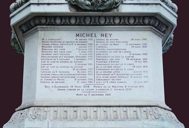 | Keywords: Carrière Michel Ney socle statue.jpg Marshall Michel Ney The Bravest of the Brave in Paris relating his military career during the Revolution and Napoleonic wars Maréchal Michel Ney Le Brave des Braves à Paris relatant sa carrière militaire durant les guerres de la Révolution et de l'Empire own Jebulon please see metadata 48 50 25 N 2 20 10 7 E Pedestals Statue of Michel Ney by François Rude Inscriptions in Paris Quality images by Jebulon Quality images of architectural elements in Paris PD-old QualityImage |