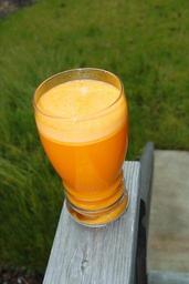 Keywords: carrot juice glass cup outside deck wood health drink beverage blended smoothie orange juice carrot food raw fresh vegetarian vegan grass