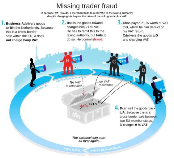 | Keywords: Carrouselfraude.svg en An illustration of missing trader fraud also known as carousel fraud in Dutch English and German per SVG switch nl Een illustratie van btw-carrouselfraude unknown ; SVG 2016-01-20 own based PDF export and reworked; http //www belastingdienst nl/wps/wcm/connect/bldcontentnl/belastingdienst/zakelijk/btw/zakendoen_met_het_buitenland/btw_carrouselfraude/btw_carrouselfraude original Belastingdienst Dutch Tax and Customs Administration ; derivative User Perhelion <br> Eng and Deu translation mainly Woodcutterty other versions File Carrouselfraude png other fields + Translate yes Commons cc-zero Tax evasion SVG diagrams in Dutch SVG diagrams in German SVG diagrams in English LicenseReview http //www belastingdienst nl/wps/wcm/connect/bldcontentnl/belastingdienst/zakelijk/btw/zakendoen_met_het_buitenland/btw_carrouselfraude/btw_carrouselfraude Natuur12 2016-01-15 |