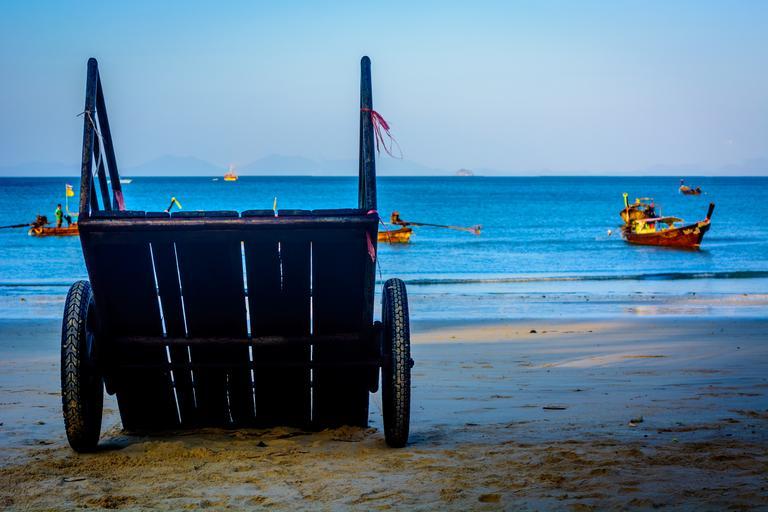 Keywords: cart wheel sand beach blue g0lden yellow ocean sea water boat rust red trip azure ao nang thailand