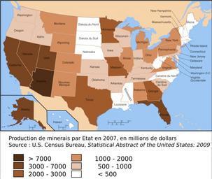 | Keywords: Carte minerais USA 2007.svg fr Carte de la production de minerais aux Etats-Unis en 2007 en valeur Carte de la production de minerais hors hydrocarbures aux Etats-Unis par Etat en 2007 Source U S Census Bureau Statistical Abstract of the United States 2009 http //www census gov/compendia/statab/2009edition html Section Natural Resources Own Urban 2009-04-23 Economic maps of the United States | ||||