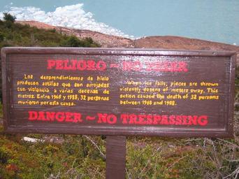 Keywords: Cartel avisando d los peligros del glaciar.JPG es Cartel avisando del peligro que suponen las astillas lanzadas a pgran velocidad tras el colapso del glaciar own Alekino 2008-02 Perito Moreno Perito Moreno Glacier